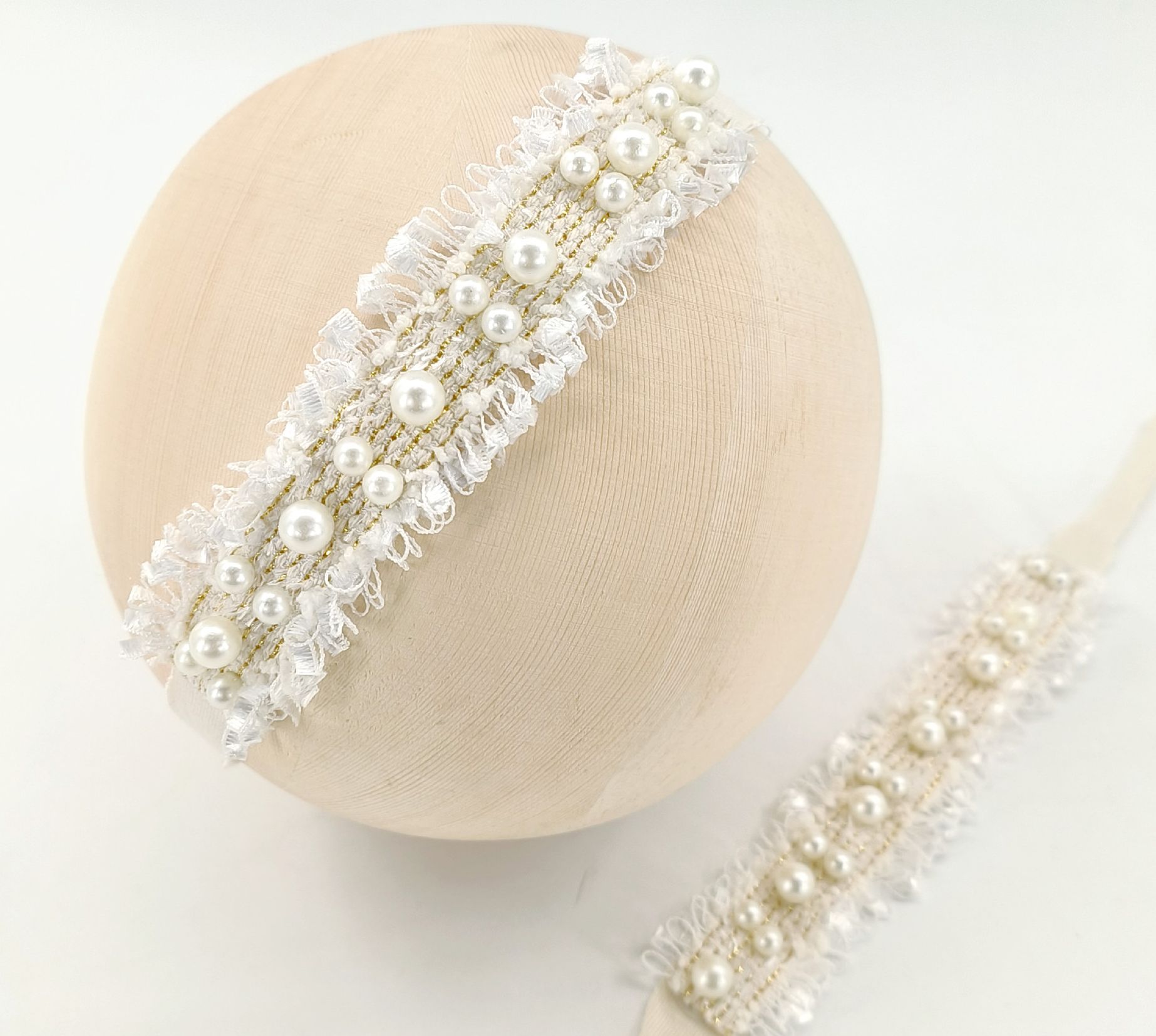 Wunderschöner Vintage-Chic: Babyhaarband aus weichem Webstoff, mit Dekoperlen und ganz zarten, zurückhaltenden Goldfäden.