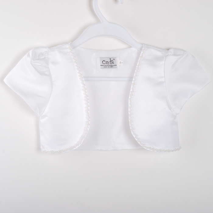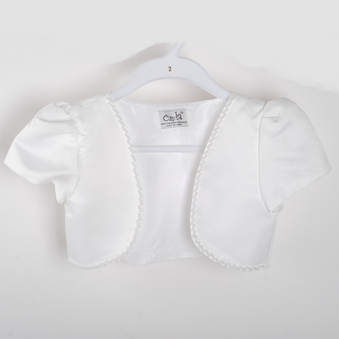 Dieses schöne Satin-Bolero Jäckchen vollendet den edlen, festlichen Look für Blumenmädchen und hübsche Prinzessinnen.