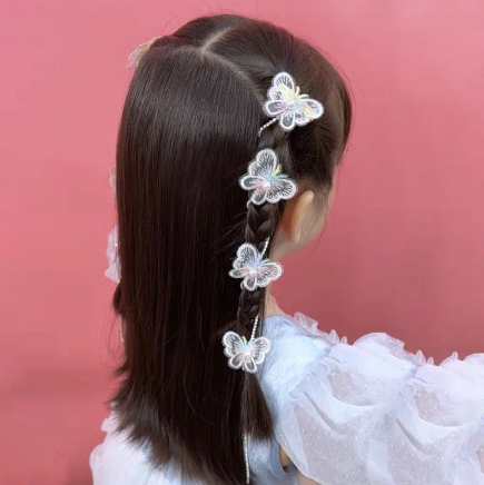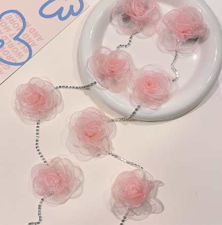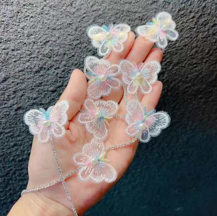 Die herzigen Bänder bestehen aus einem feinen, ca. 30 cm langen Kettchen, an welchem die zarten rosa Blüten oder weiss schimmernden Schmetterlinge befestigt sind.