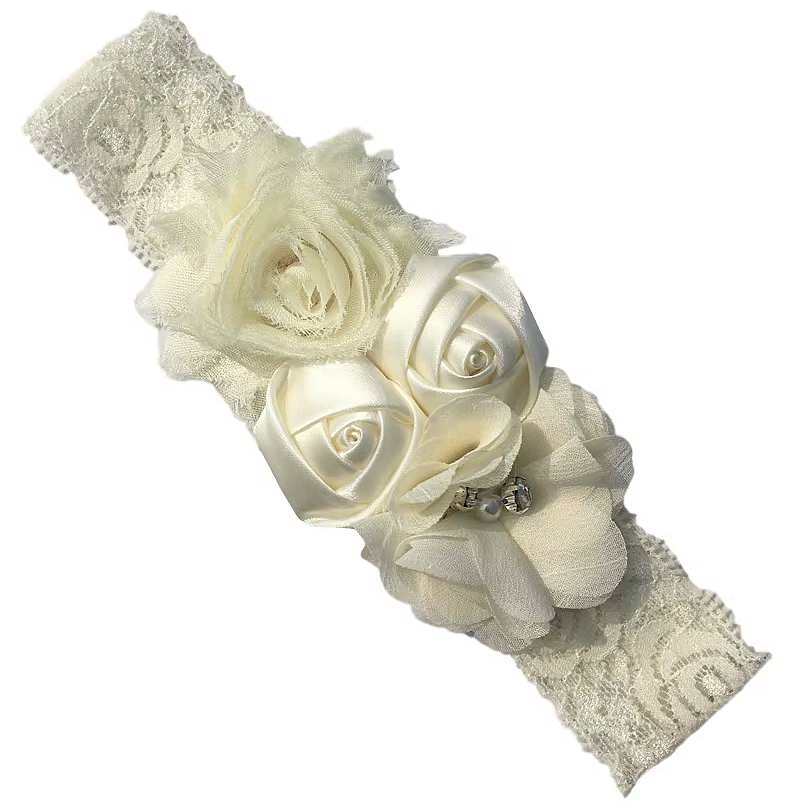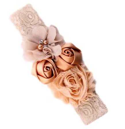 Das Haarband ist weich, mit Spitzenstoff, elastisch, reich verziert mit Stoffblüten.