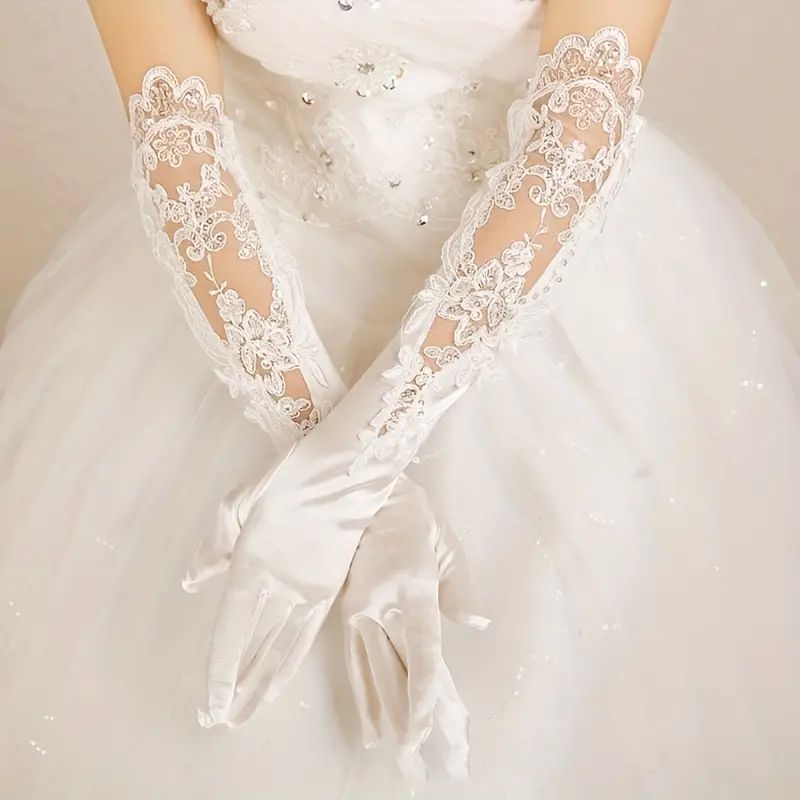 Lange sehr elegante Handschuhe mit Spitzen und feinen Silber-Pailletten