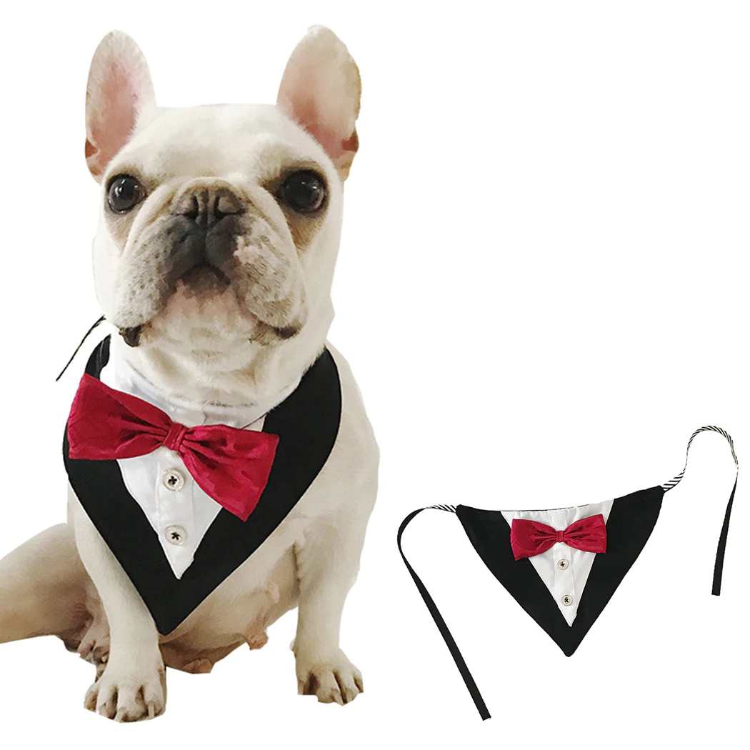 Tolles Hundebandana mit schönen silbernen Knöpfen, weissem Stoff mit feiner Struktur wie ein Smoking Hemd, und eine rote Satinfliege!