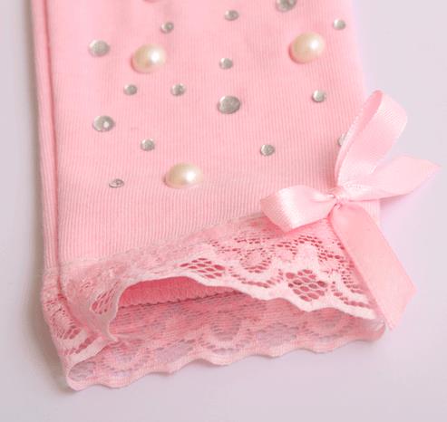 Diese schönen Leggins sind aus weicher Baumwolle und mit vielen Strass-Steinchen und Perlen besetzt. Mit Spitzenabschluss und süsser Schleife. Volle Beinlänge. Farben: rosa, dunkelblau, elfenbein.