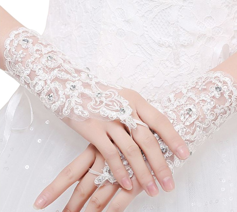 Diese schönen Spitzenhandschuhe sind mit diskreten Glitzersteinchen verziert.