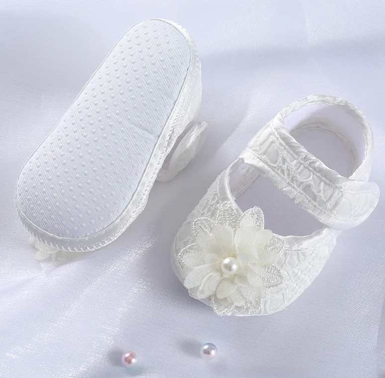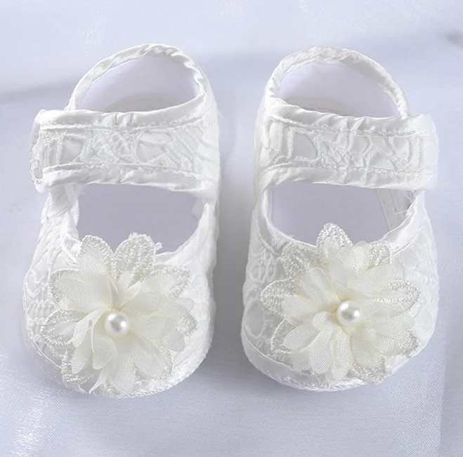 Wirklich süss und passend zu vielen unserer Taufkleider: Hübsche, weiche Taufschuhe im Satin-Look mit Spitzen.