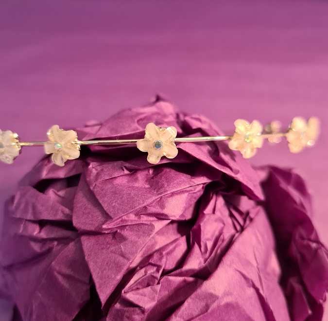 - goldfarbener, feiner Haarreif mit kleinen emaillierten Blümchen mit einem Glitzersteinchen in der Mitte