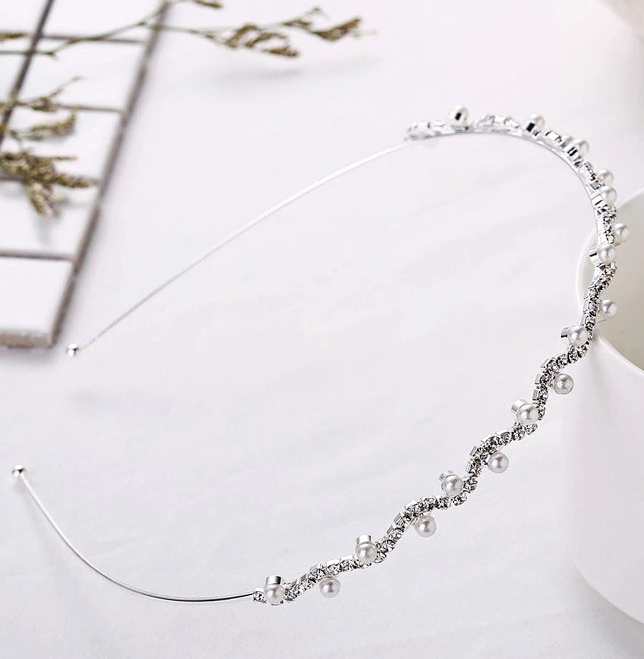 - silberfarbene, feine, elegante Tiara in Wellenform mit kleinen Perlen und Strasssteinchen