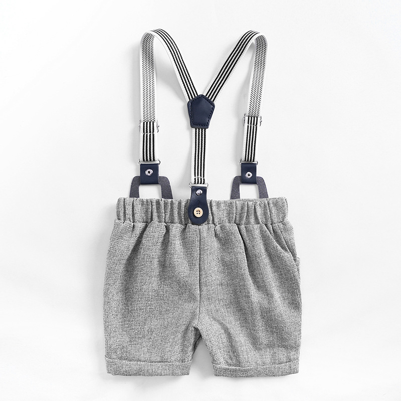 Sommer-Set für kleine Jungs, chic in hellgrau-weiss mit kurzen Hosen, Fliege und Hosenträgern