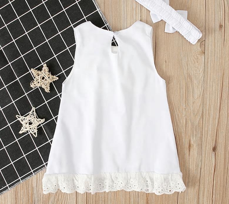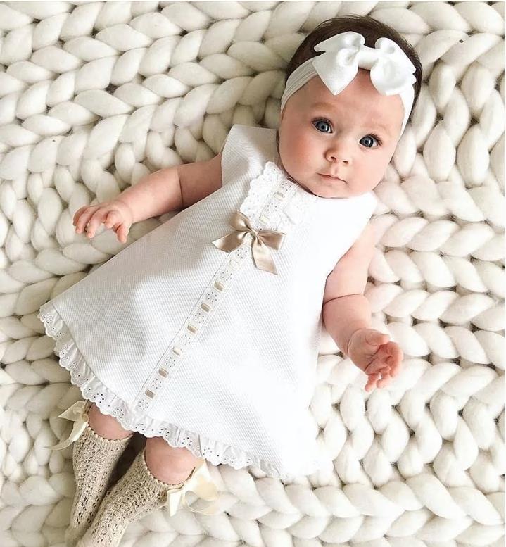 Weisses Kleidchen mit schönen Details, wie Spitzendeko und goldfarbenem Satin-Schleifchen. Solange Vorrat verfügbar.