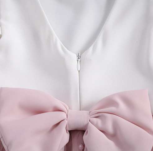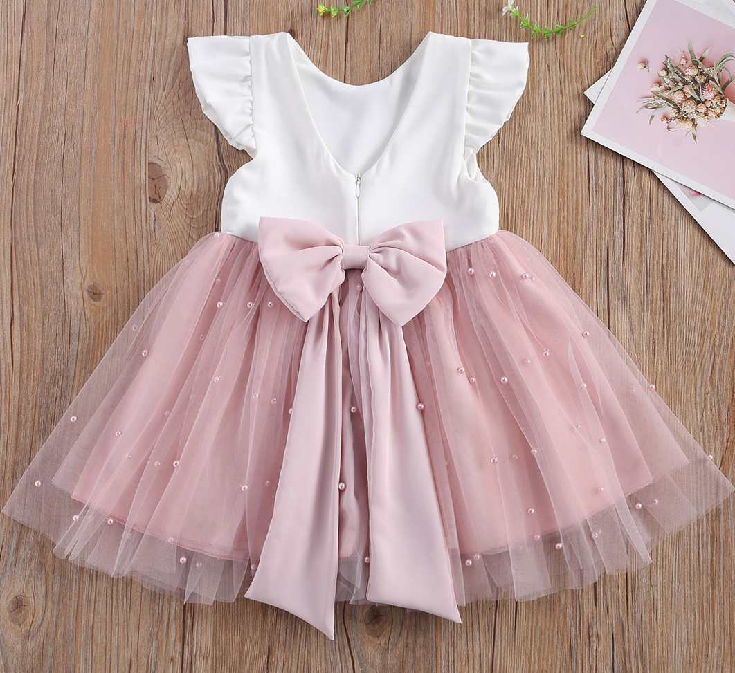 Schönes Altrosa, kombiniert mit Weiss. Die hübschen Ärmel und die Perlendeko im weichem Chiffon-Röckchen sind tolle Hingucker.