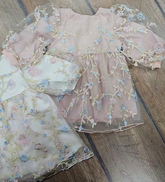WIr haben zwei Varianten für Sie: Rosa als Grundfarbe oder ein sanftes Weiss. Beide mit wunderschönen, feinen Stickereien auf dem weichen Chiffon.