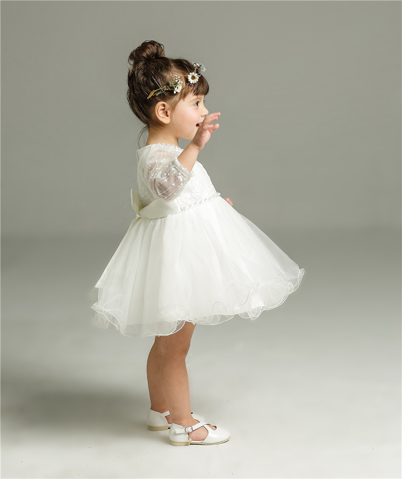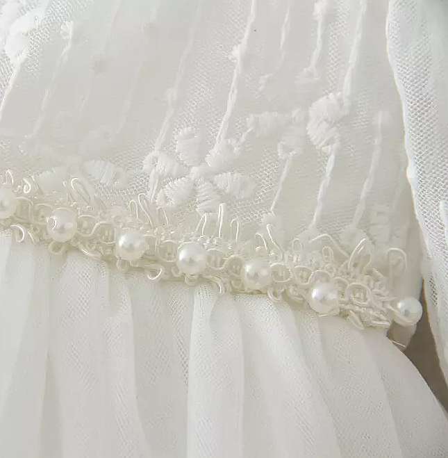 Mobile Preview: Elegantes, feines Kleidchen für Taufe und schöne Anlässe, weiss mit Perlen-Taillenband und Spitzenstickereien