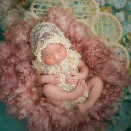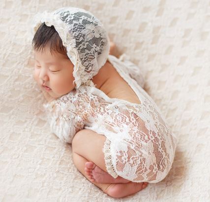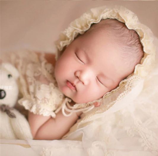 Zweiteilig, bestenend aus Body und Mützchen. Aus ganz weichem Spitzenstoff...
