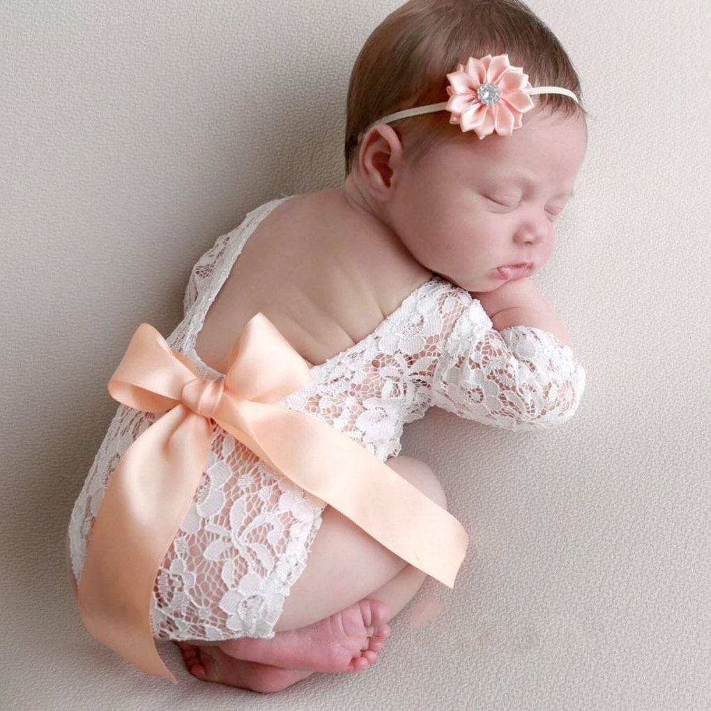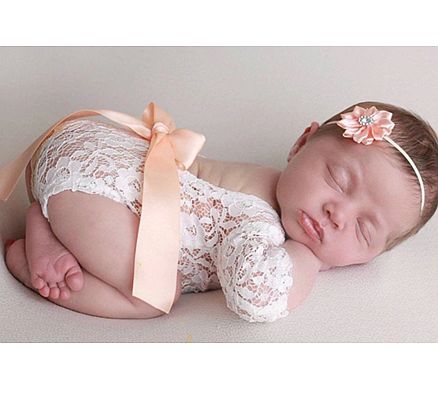 Wunderschönes Body-Set aus naturweissem, weichem Spitzenstoff - mit Haarband und Schleife in Apricot