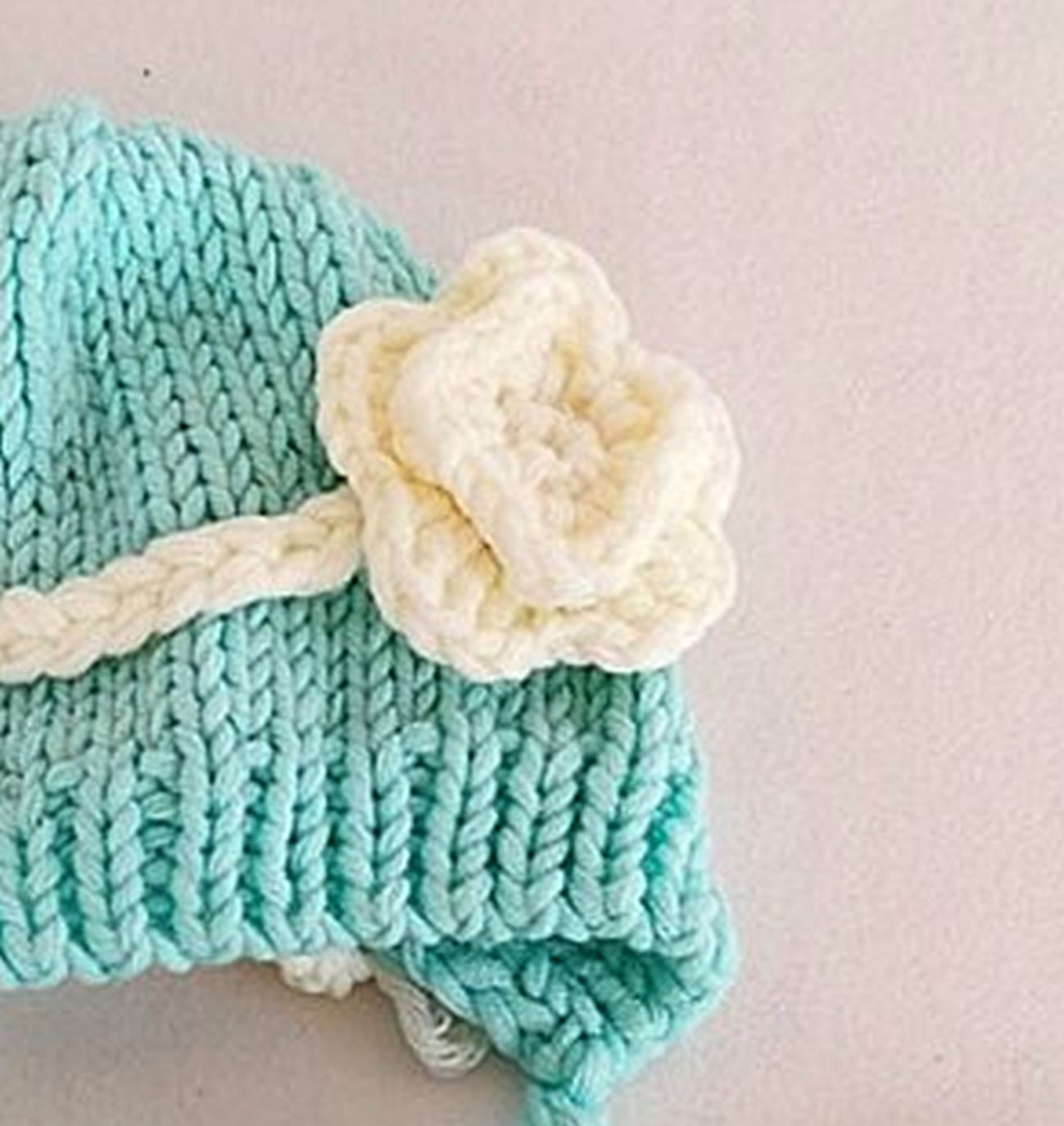 Aus weichem Garn gestrickt, das Mützchen mit einer süssen Blume in passendem Crème verziert.