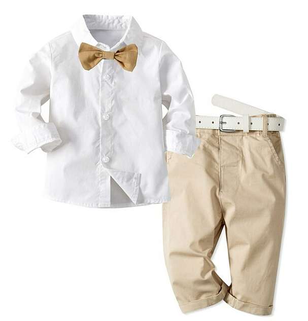 Festliches Anzug-Set mit Chinos in hellbraun und weissem Hemd, Fliege und Gurt - solange Vorrat