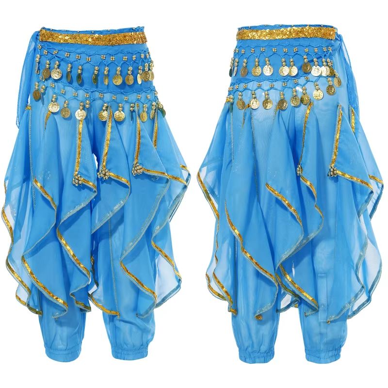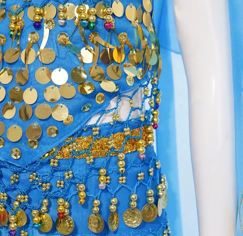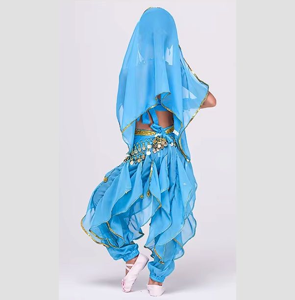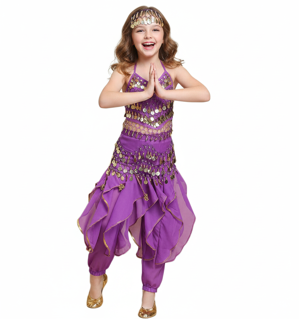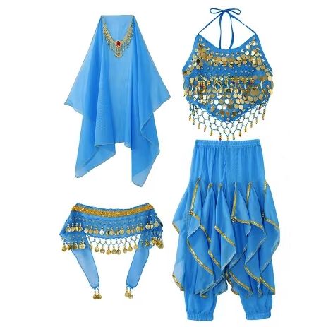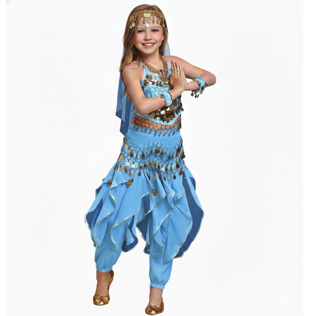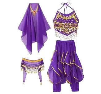 Zum Set gehören: Hose, Oberteil, Armbänder, Kopfschmuck mit Schleier, Gürtel mit Golddeko.