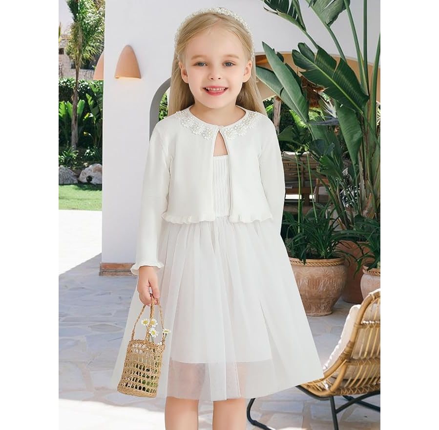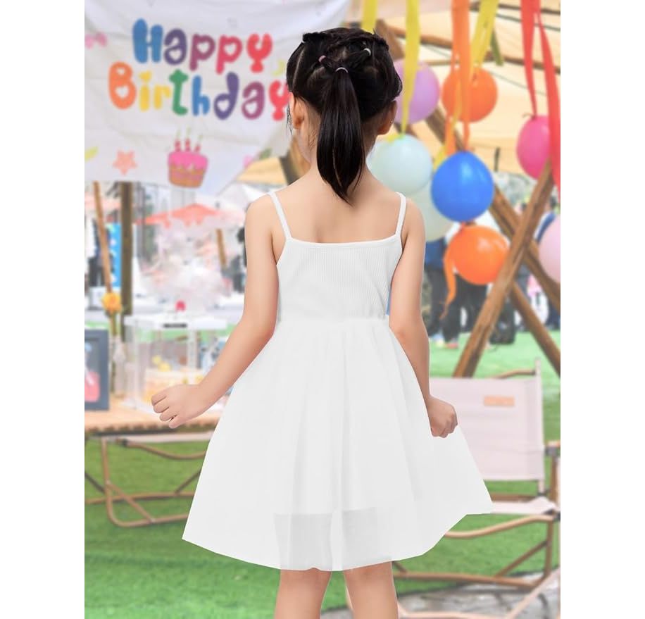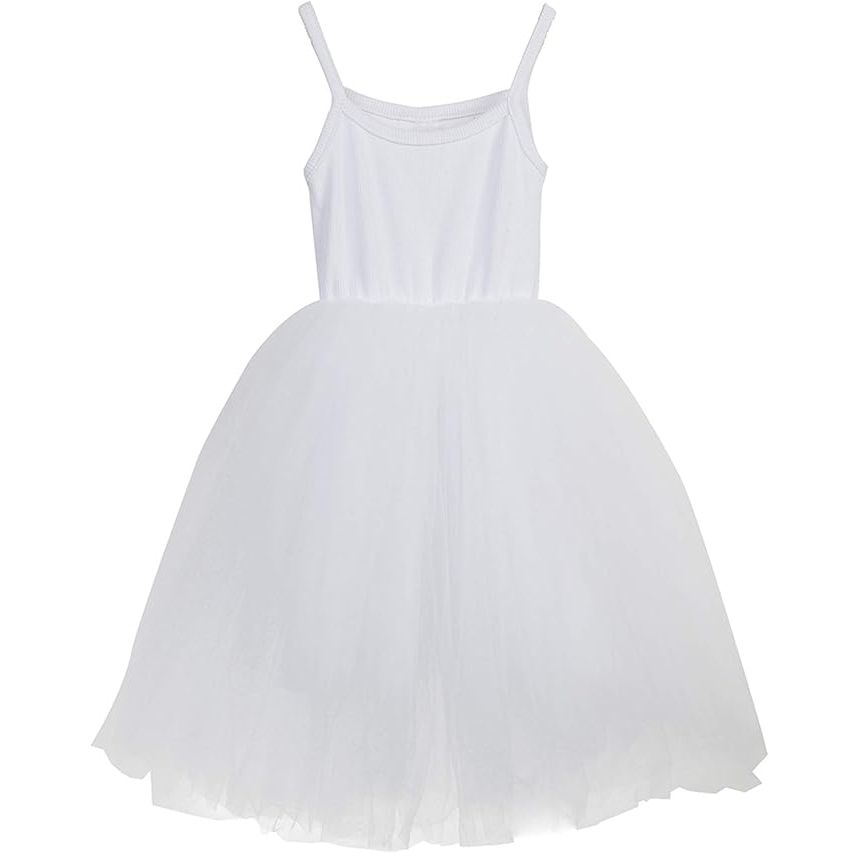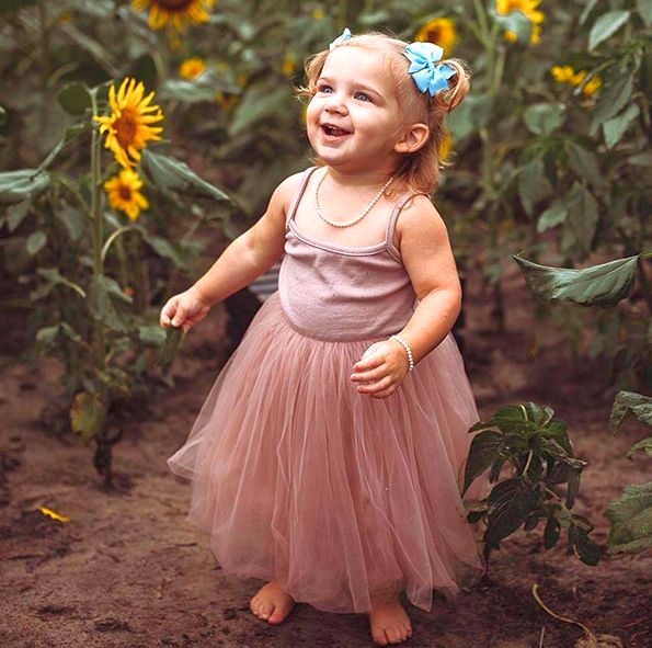 Das Kleidchen besteht aus dem Oberteil mit feinen Trägern und dem Rockteil aus weichem, bauschigen Tüll.