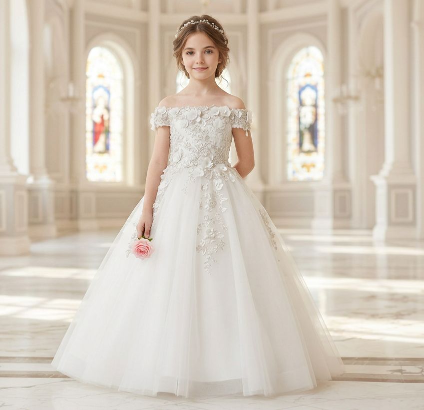 Dieses wunderschöne, schulterfreie Blumenmädchenkleid mit seinen zarten Blütenapplikationen passt perfekt zum festlichen Anlass!