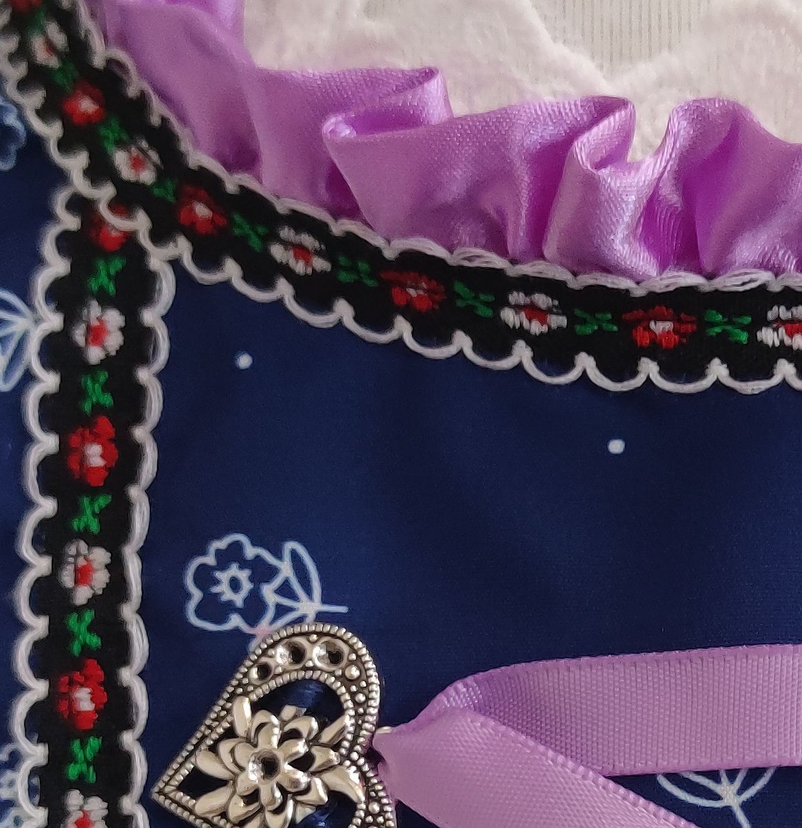 Farben: Grundkleid dunkelblau mit hellblauen Blümchen und klassischem Trachtensaum rot/grün/weiss mit Blümchen.