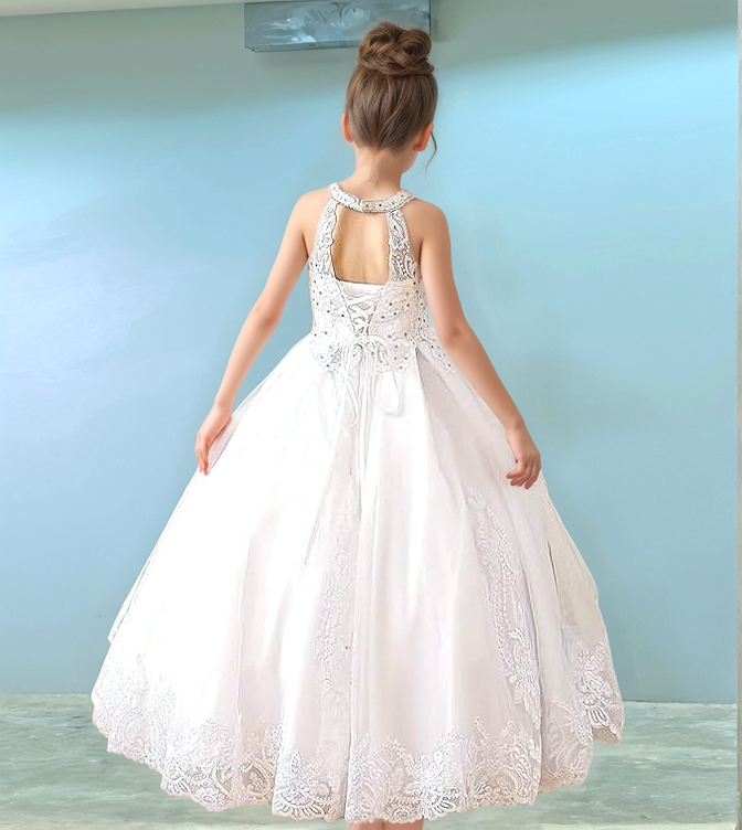 Der Rock ist mit Spitzen verziert, was den feierlichen, glamourösen Look vollendet.
