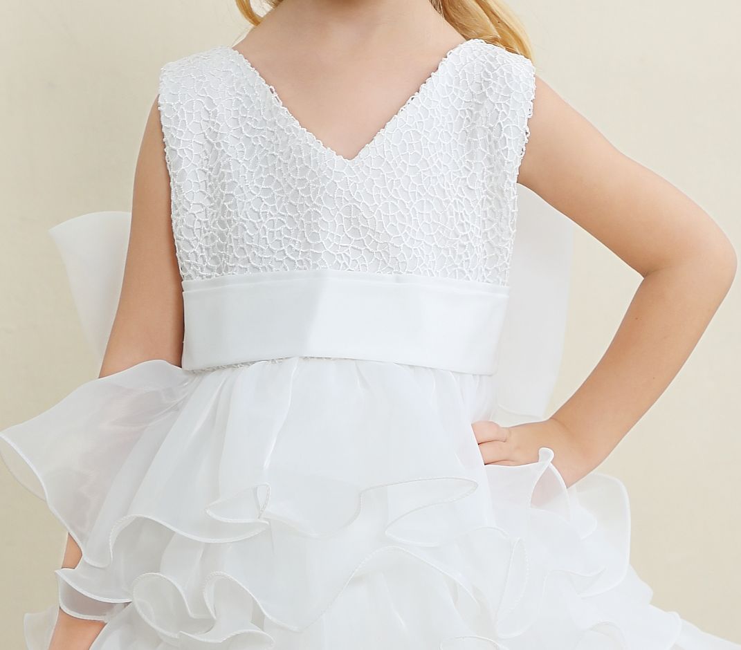 Oberteil mit hübsch unterlegten Spitzen verziert, schönes Satin-Taillenband, Reissverschluss im Rücken.
