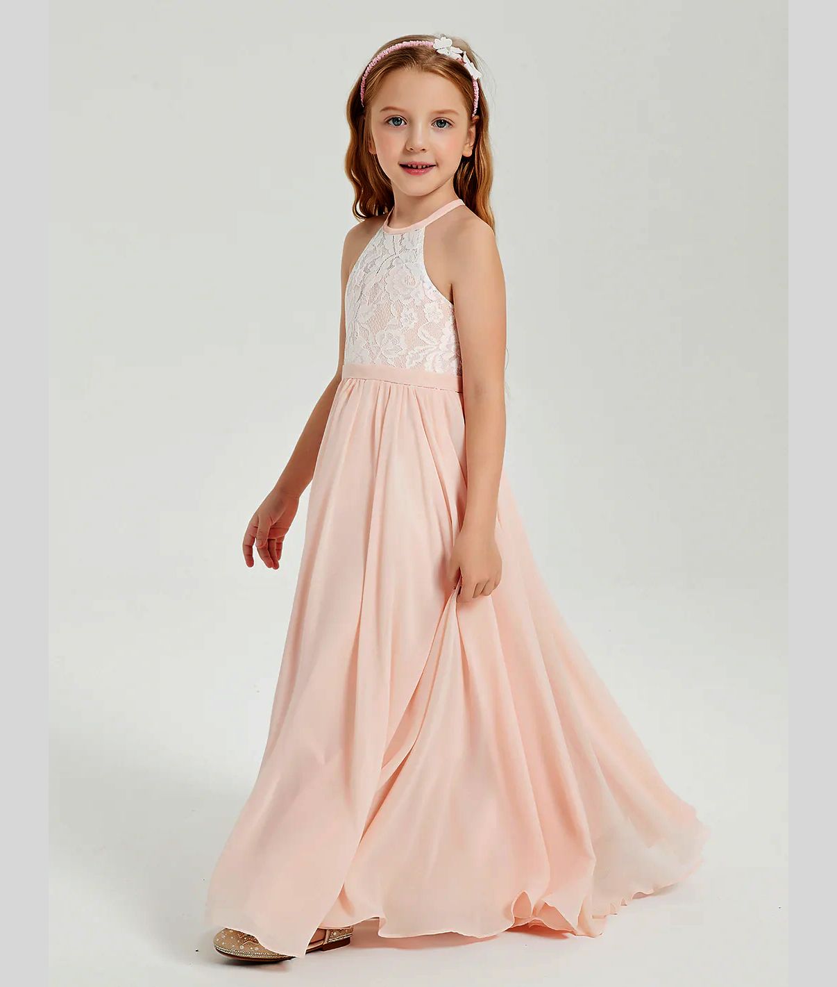 Zauberhaftes schmales Neckholder-Kleid für schöne Anlässe - bicolor elfenbein-puderrosa, Grösse 122