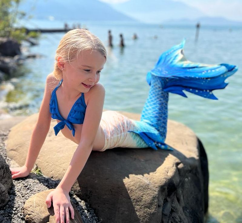 Das Set besteht aus unserer Pinkvanille-Flosse (Fussteil), dem hübschen Bezug und einem farblich passenden Bikini.